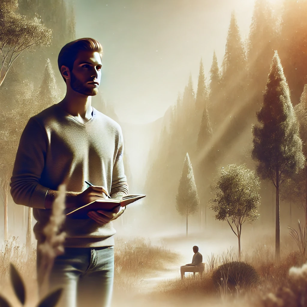 • DALL·E 2024-09-12 21.43.50 – A serene and focused individual standing amidst a calm landscape, perhaps a peaceful forest or park. They are calmly gazing ahead, with an air of dete